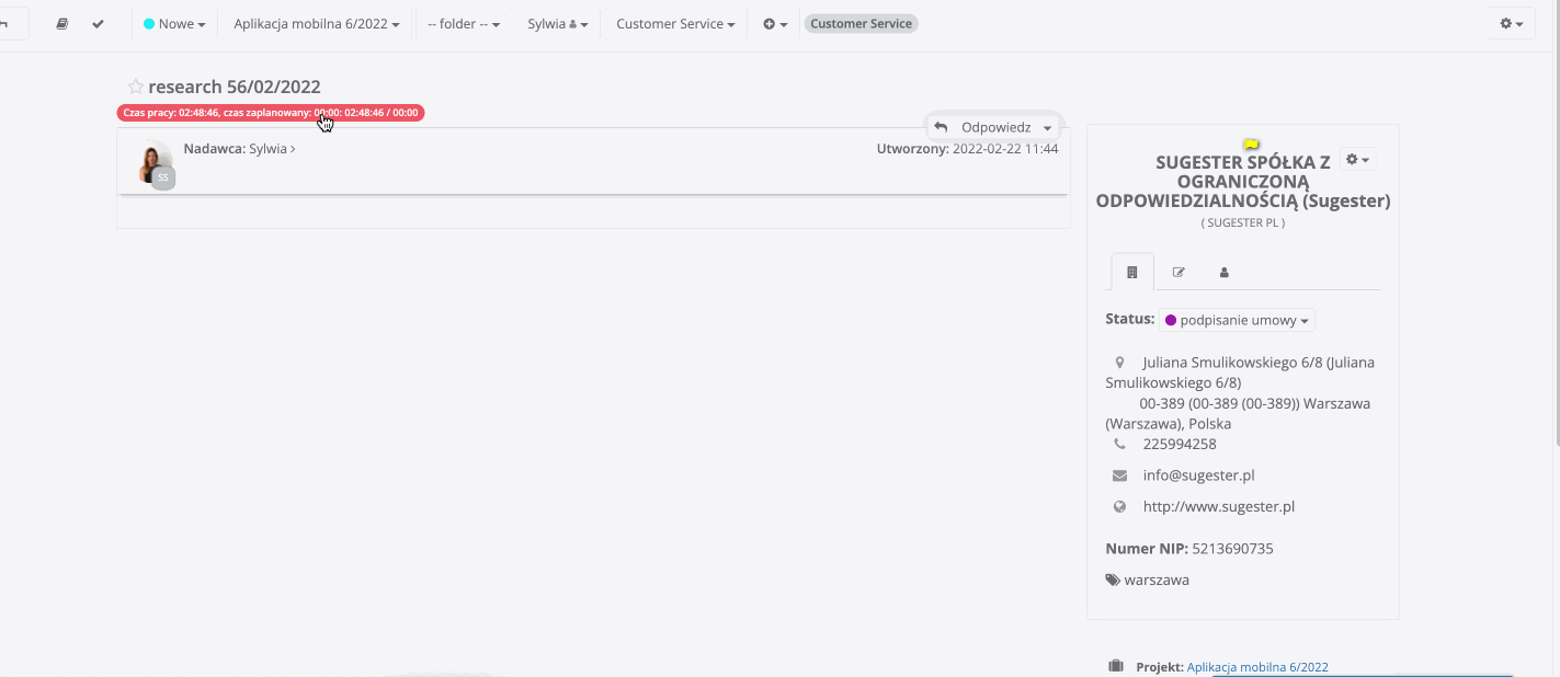 Będąc w danym zadaniu, można szybko zweryfikować ile czasu sumarycznie użytkownik poświęcił na to zadanie. Wystarczy jednym kliknięciem przejść do timesheetu, a wtedy system wyświetli podsumowanie godzin tylko dla tego zadania. Aby przejść do timesheetu, trzeba kliknąć pole Szacowany czas pracy, znajdujące się w lewym górnym rogu, między tytułem a treścią zadania. System pokaże timesheetu i wyświetli czas poświęcony na to zadanie z podziałem na poszczególne dni. Dzięki temu można przeanalizować kiedy i ile czasu zostało poświęcone na to zgłoszenie. Łatwiej wtedy np. o rozliczenie z pracownikiem lub klientem.