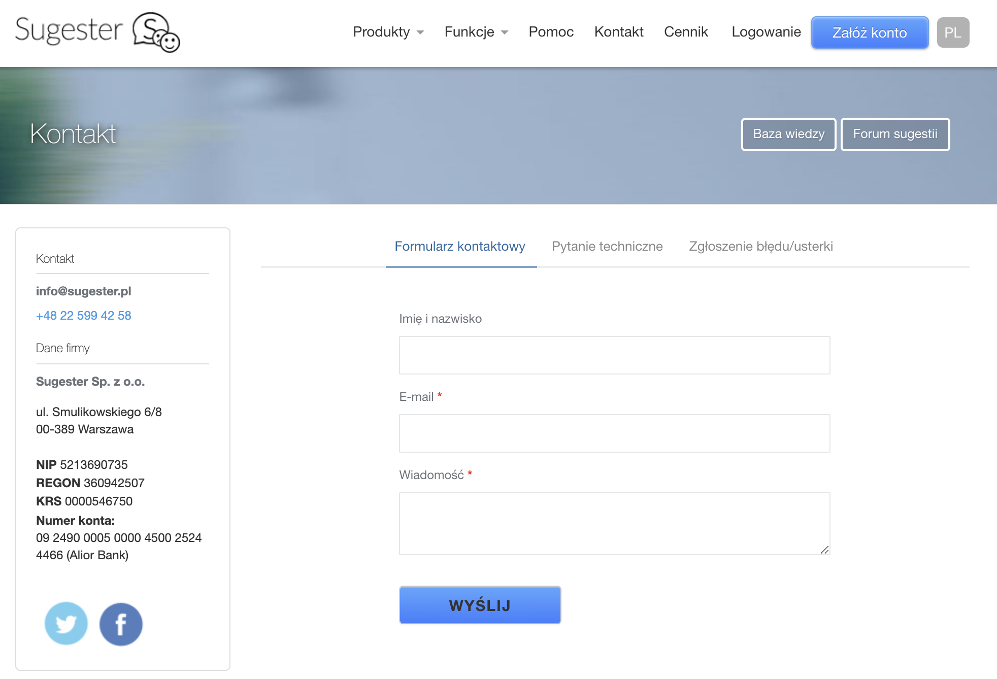 W Sugesterze możesz tworzyć formularze, z których dane będą zbierane i dostępne w systemie. Mogą to być formularze kontaktowe, reklamacyjne czy ankieta zadowolenia klienta (NPS). Formularze doskonale sprawdzają się w miejscu wymagającym zapisania się, subskrypcji lub pobrania pliku z ofertą. Przy pomocy formularzy można także zbierać zgody na przetwarzanie danych osobowych.