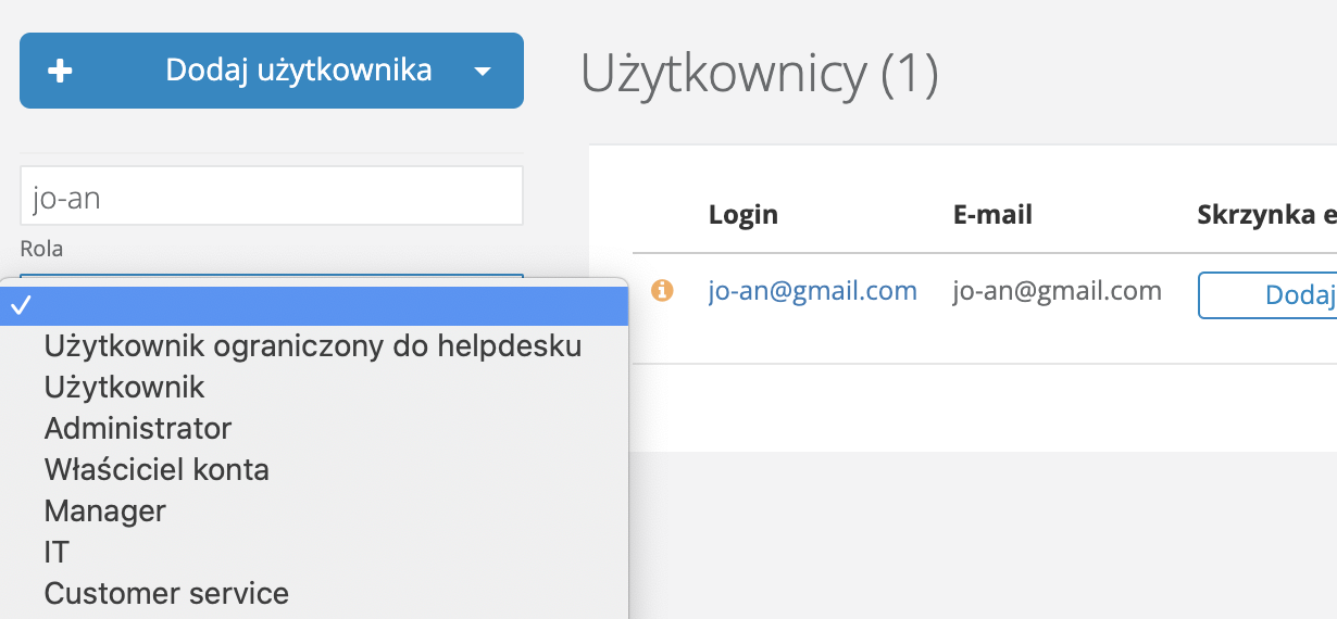 - roli - wybierając z listy rozwijanej nazwę roli. Role to uprawnienia jakie zostały nadane użytkownikom. W tym miejscu możesz więc wyszukać wszystkich pracowników z uprawnieniami np "manager"czy "handlowiec" w Twojej firmie