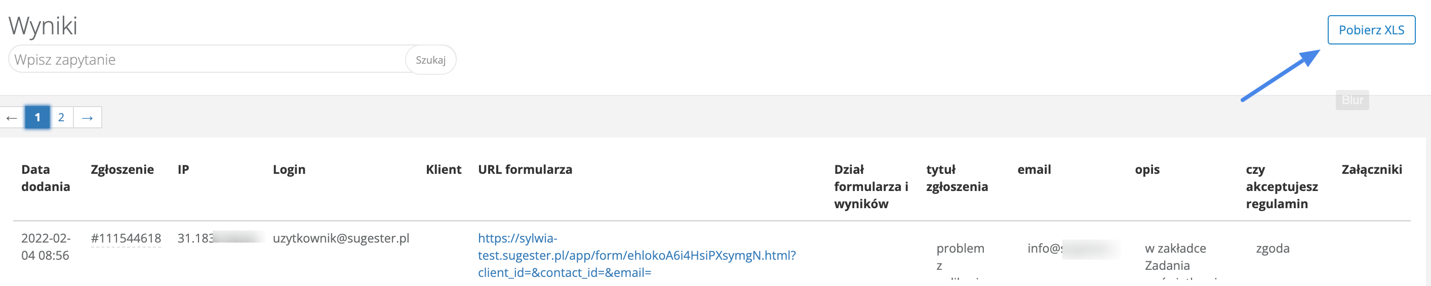 W kolejnych kolumnach znajdują się nagłówki odpowiadające pytaniom z ankiety. W tabeli wyników wyświetlają się wszystkie odpowiedzi udzielone w ankiecie. Jeśli jakaś z nich jest dłuższa, wystarczy najechać kursorem na jej treść, by wyświetliła się w całości. Wyniki można wyeksportować do pliku xls, klikając przycisk Pobierz XLS.