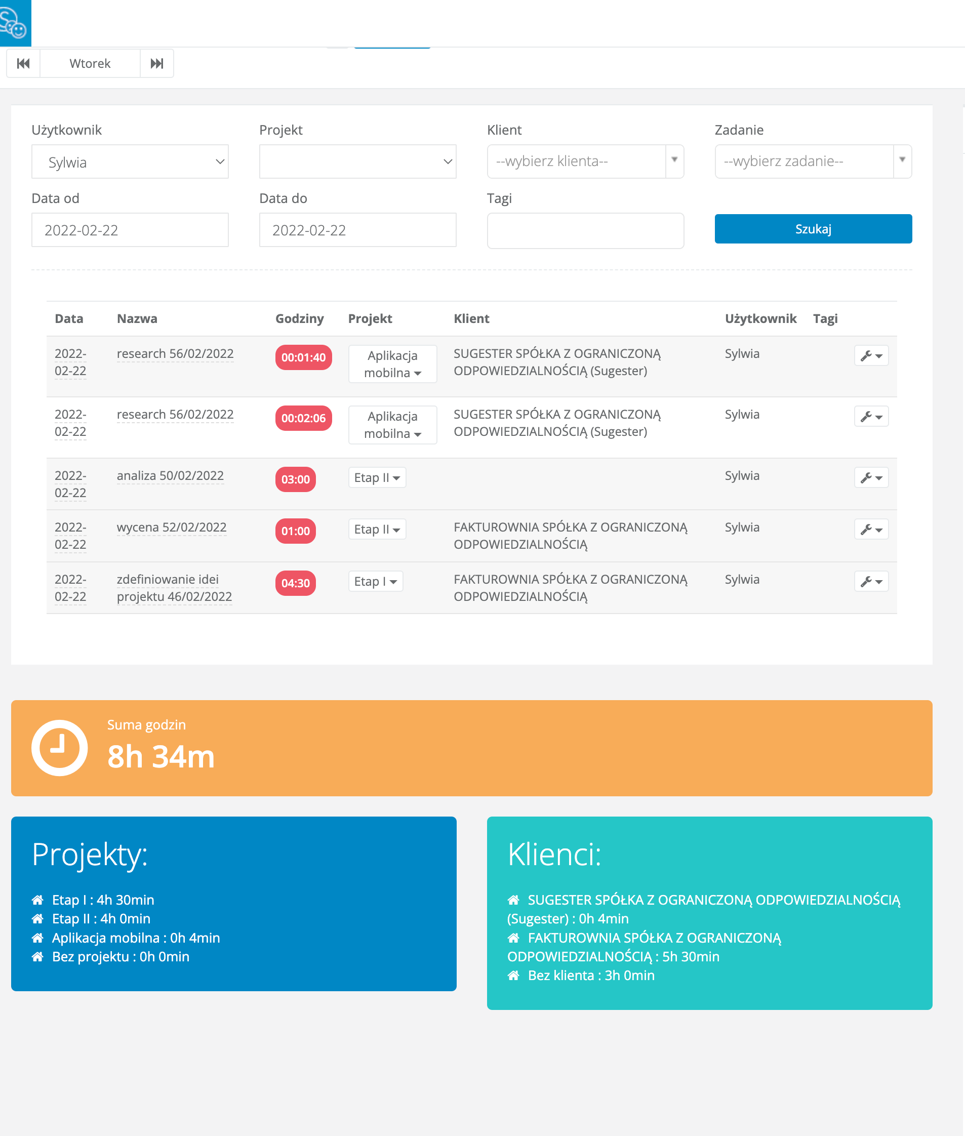 Klient - znajdź klienta, z którym chcesz się rozliczyć za wykonaną pracę i poświęcony mu czas