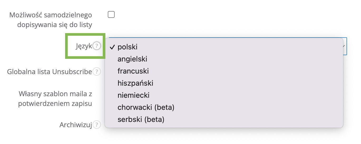 Każda z list odbiorców może mieć ustawiony inny język. Obecnie mamy dostępnych 5 języków: polski, angielski, francuski, hiszpański i niemiecki.