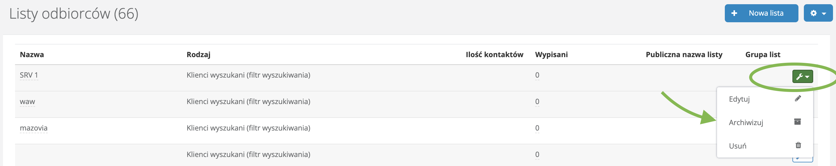 Aby przenieść daną listę odbiorców do archiwum, wystarczy wejść z głównego menu w zakładkę Emailing -> Listy odbiorców i rozwinąć ikonkę klucza przy liście, którą chcemy zarchiwizować, a następnie wybrać Archiwizuj. Wybrana lista odbiorców zniknie z głównej listy i pojawi się na liście archiwum.