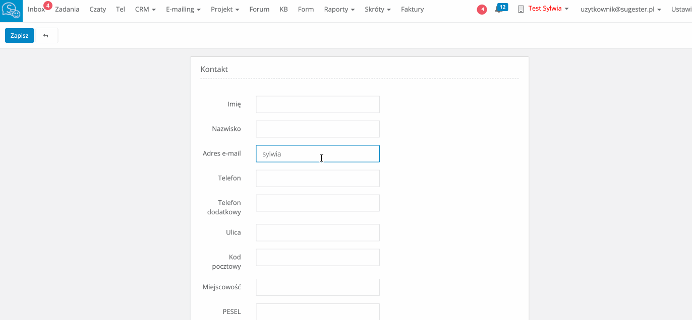 System wyszukuje istniejący już kontakt po adresie email lub numerze telefonu lub imieniu i nazwisku. Oznacza to, że jeśli podczas dodawania nowego kontaktu do bazy, zostanie wpisany adres email lub telefon lub imię i nazwisko, które w bazie już istnieją, system wyświetli te wpisy.