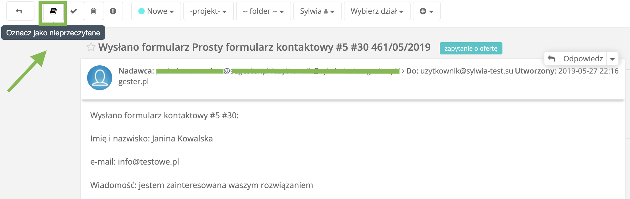 - z poziomu otwartego maila - po wejściu z inboxu w treść danego maila możemy oznaczyć go ponownie jako "nieprzeczytany", klikając ikonkę "książki" w lewym górnym rogu