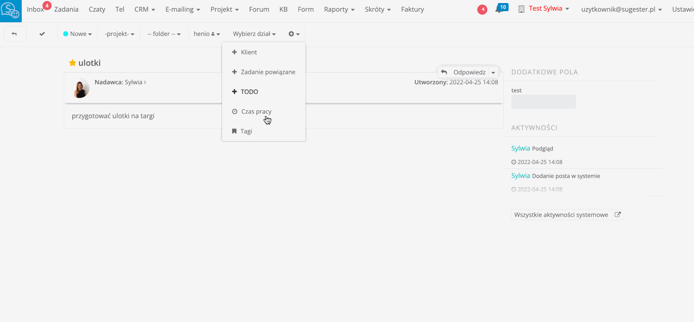 Po aktywowaniu opcji Tagowanie emaili i zadań w oknie dodawania zadania pojawi się pole "Tag". Po zapisaniu zadania, tag zostanie dodany do listy tagów w Sugesterze i będzie można go użyć przy kolejnym zadaniu. Dodając w zadaniach nowe tagi, tworzy się lista tagów, która jest wyświetlana przy tagowaniu każdego nowego zadania. Możemy używać tagów z listy lub dodawać nowe, jeśli żaden istniejący tag nie jest adekwatny do opisywanego w zadaniu problemu. Listę tagów można edytować, ale dostęp do tej opcji ma jedynie admin i właściciel konta.Dodawanie tagu do istniejącego już w systemie zadania