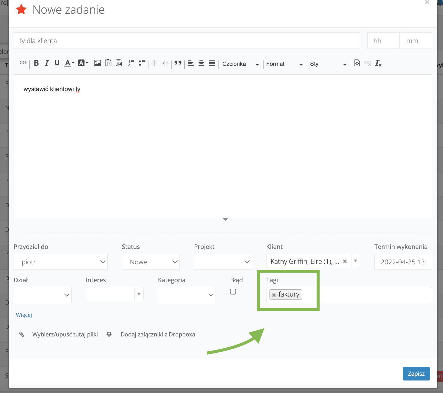 Czasami istnieje konieczność otagowania istniejącego już w systemie zadania. Można to zrobić na 2 sposoby: 1. W edycji danego zadania, wystarczy: