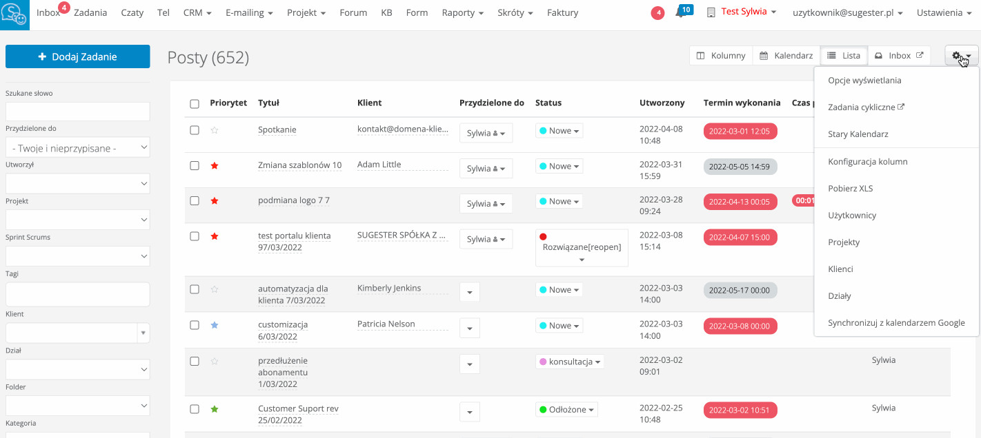 Sugester pozwala dostosować widok listy zadań do wymagań i preferencji konkretnego użytkownika. Wystarczy wejść w zakładkę Zadania, kliknąć ikonkę trybiku z prawej strony i wybrać Opcje wyświetlania.