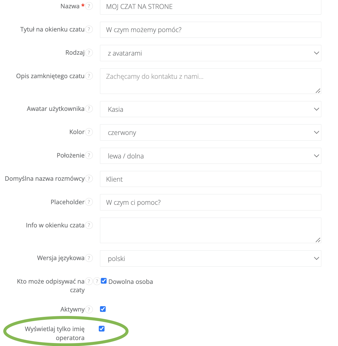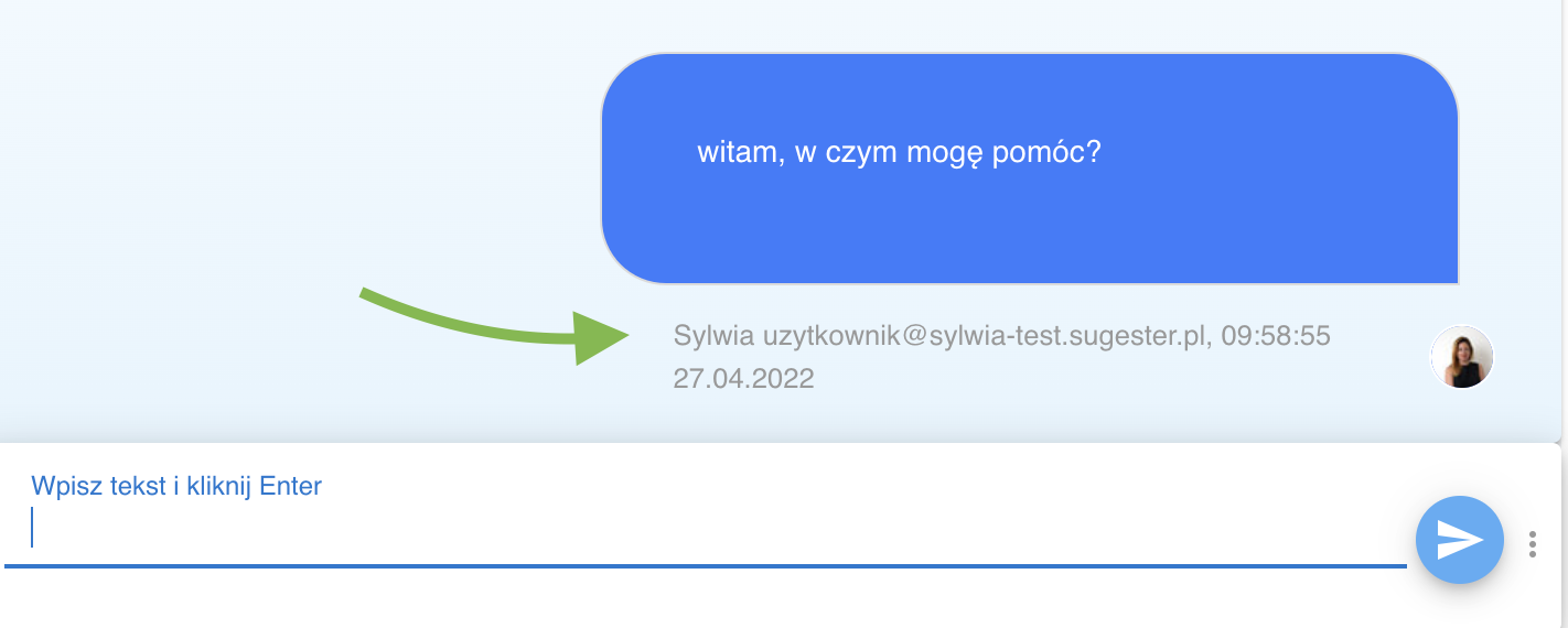 W Konfiguracji czatu jest możliwość wybrania jaką nazwę operatora ma widzieć klient podczas rozmowy w okienku czatu. Najczęściej wyświetlane jest samo imię lub imię i nazwisko operatora. W Sugesterze, dodatkowo oprócz nazwy zawsze też wyświetla się adres email danego operatora.