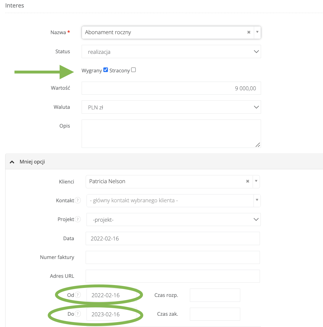 Pole "wygrany"/"stracony" może być też uzupełniane automatycznie przez system, jeśli uzupełnimy w danym interesie pola "Od" i "Do". Najczęściej takie rozwiązanie jest wykorzystywane, jeśli rozliczamy się z klientem na podstawie wykupionego przez niego abonamentu. Abonament wykupywany jest na konkretny okres czasu.