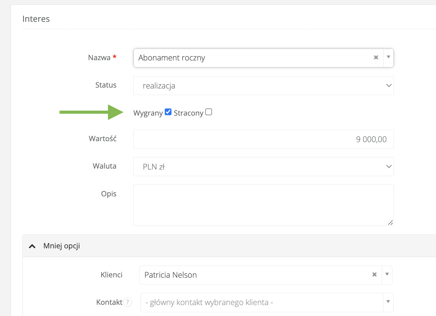 Chcąc zamknąć szansę sprzedaży, wystarczy zaznaczyć jeden z checkboxów w edycji danego interesu. W zależności czy sprzedaż zakończyła się sukcesem, czy porażką należy zaznaczyć checkbox "Wygrany" lub "Stracony".