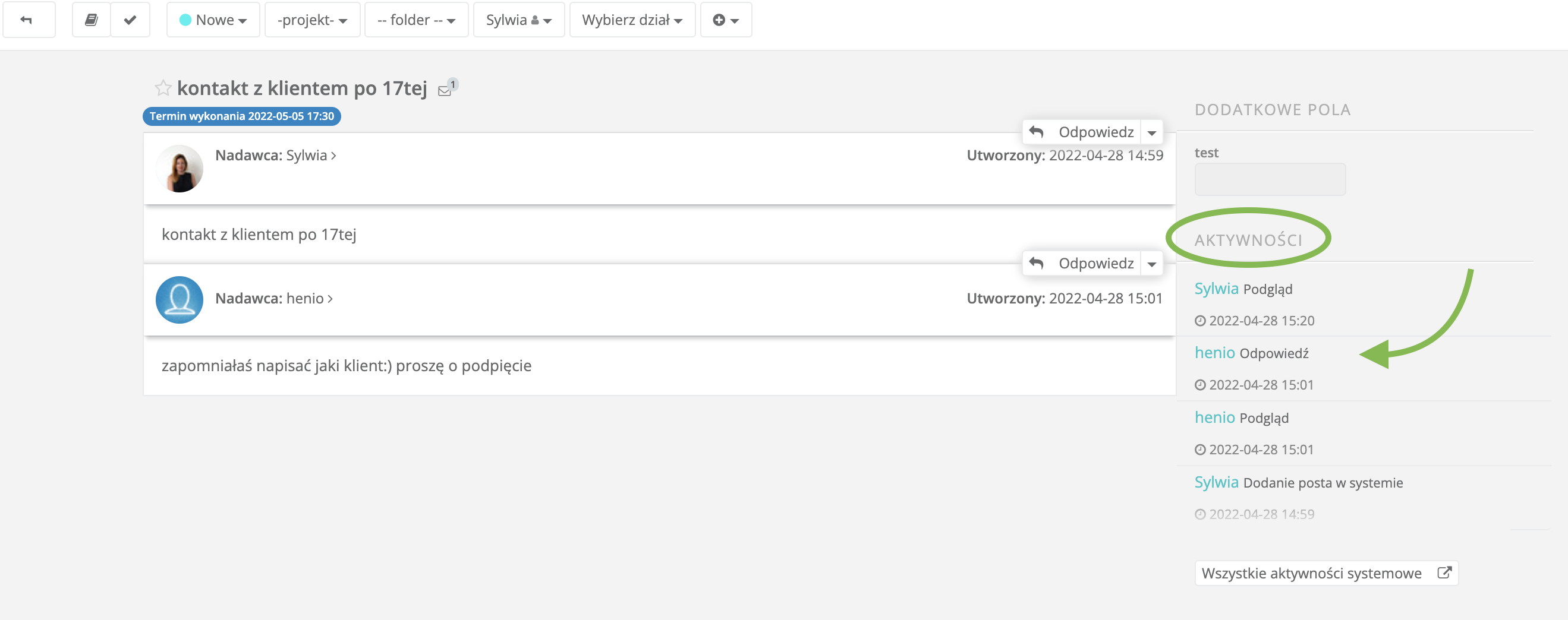 Wchodząc w dane zadane w Sugesterze, można sprawdzić co się z danym zadaniem działo od momentu kiedy pojawiło się w systemie aż do jego zamknięcia. Służą do tego aktywności systemowe, które znajdują się po prawej stronie w widoku zadania.