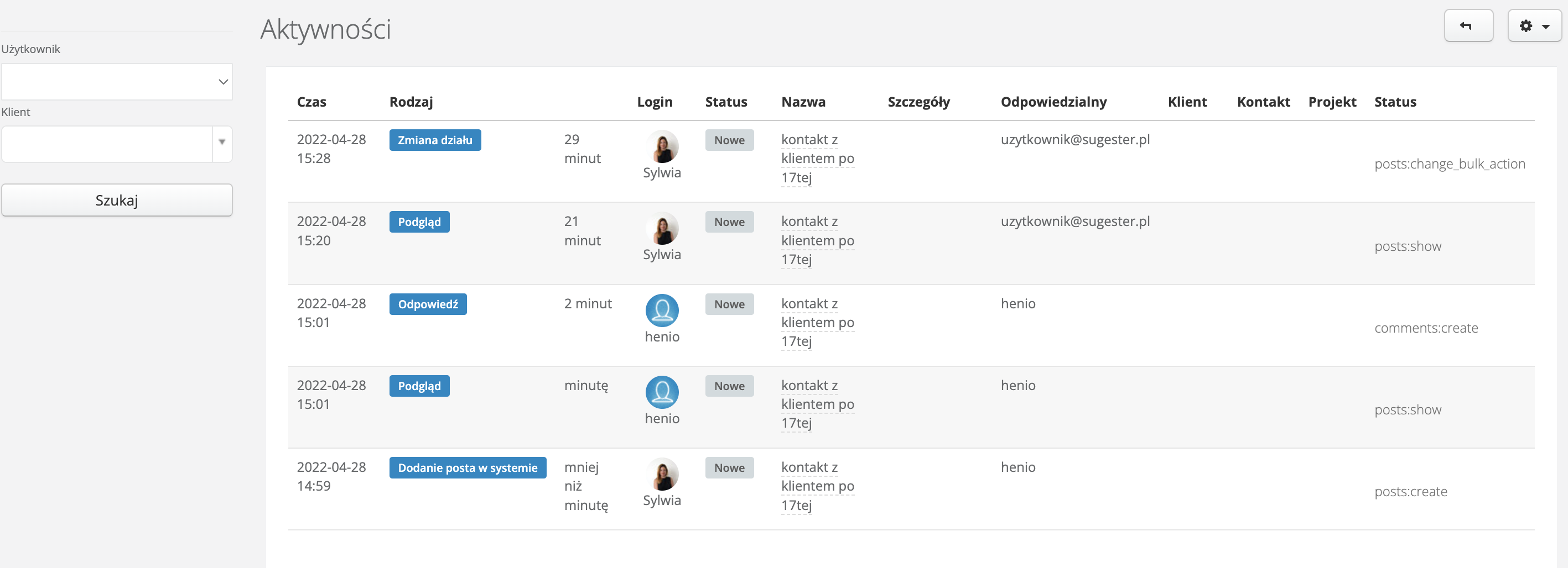 Przy liście jest wyszukiwarka aktywności, która pozwala wyszukiwać po takich danych jak Użytkownik lub Klient.