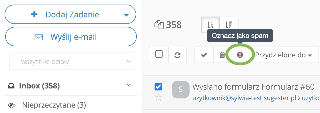 - zaznaczyć checkbox przy mailu, który ma trafić do spamu