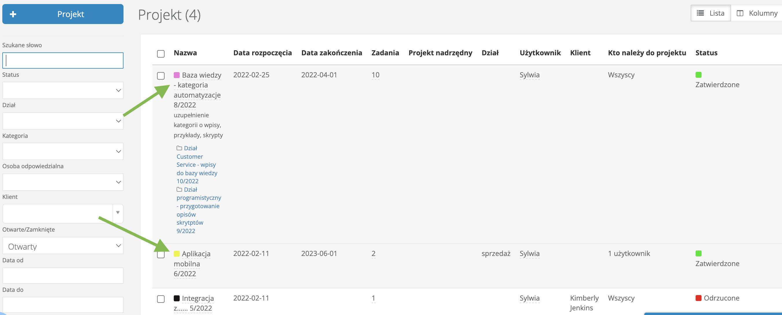 W każdym projekcie jest możliwość nadania mu określonego koloru. Kolory mogą być związane z kolorystyką firmy, kolorem dominującym klienta lub dowolnym kolorem jaki wybierzemy sobie, by oznaczyć projekt. Nadawanie określonej kolorystyki projektowi może służyć jego wyszczególnieniu, jeśli prowadzimy kilka projektów, łatwiej nam będzie odnaleźć go na liście. Projekty będą też bardziej widoczne w widoku kolumnowym zadań.