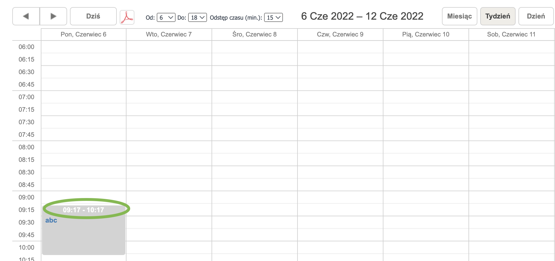 Przedział czasowy wyświetla się tylko w widoku kalendarza tygodniowym i dziennym. W widoku miesięcznym wyświetlana jest godzina rozpoczęcia zadania.