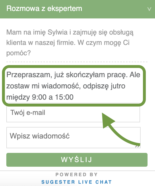 W konfiguracji czatu można ustawić w jakie dni oraz w jakich godzinach czat jest dostępny. Warto też ustawić komunikat, gdy czat jest offline. Wtedy odwiedzający naszą stronę będzie wiedział, że np. na dziś już skończyliśmy pracę, ale że może nam zostawić wiadomość. Przemyślany komunikat o niedostępności powinien mimo wszystko zachęcić odwiedzającego stronę do pozostawienia swoich danych. W zamian powinniśmy mu zagwarantować, że dostanie odpowiedź na następny dzień, w godzinach pracy biura.