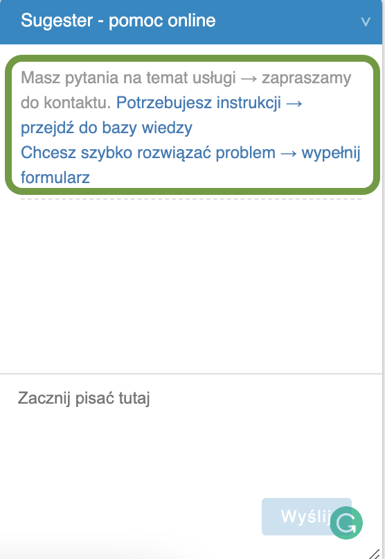 Tutaj możemy dodać np. godziny pracy biura, linki do bazy wiedzy/FAQ, opis eksperta, który obsługuje czat lub dać info o cotygodniowej promocji.
