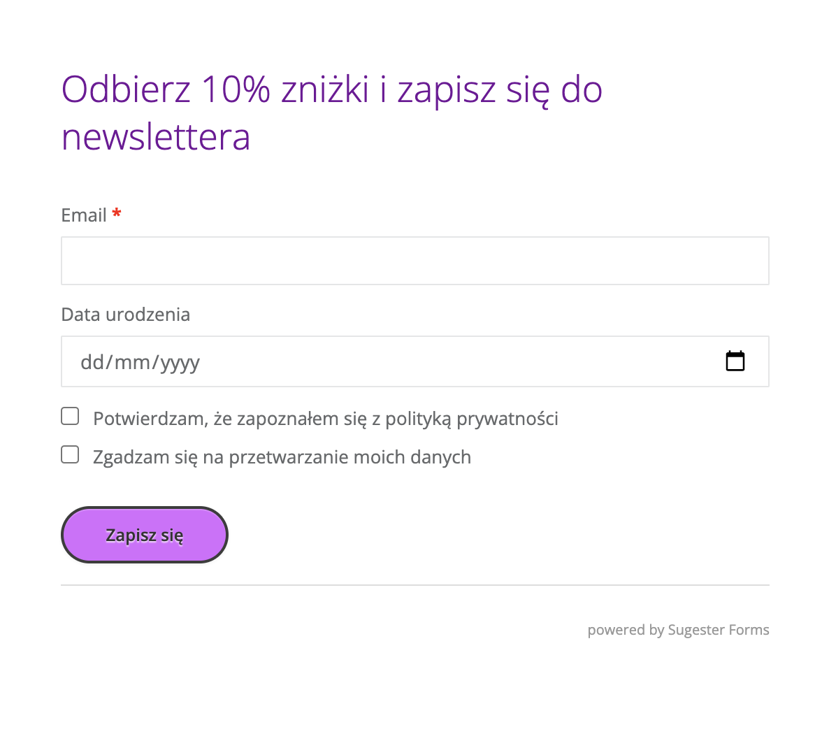 Formularzy z Sugestera można użyć jako formatki do zapisania się na newsletter.