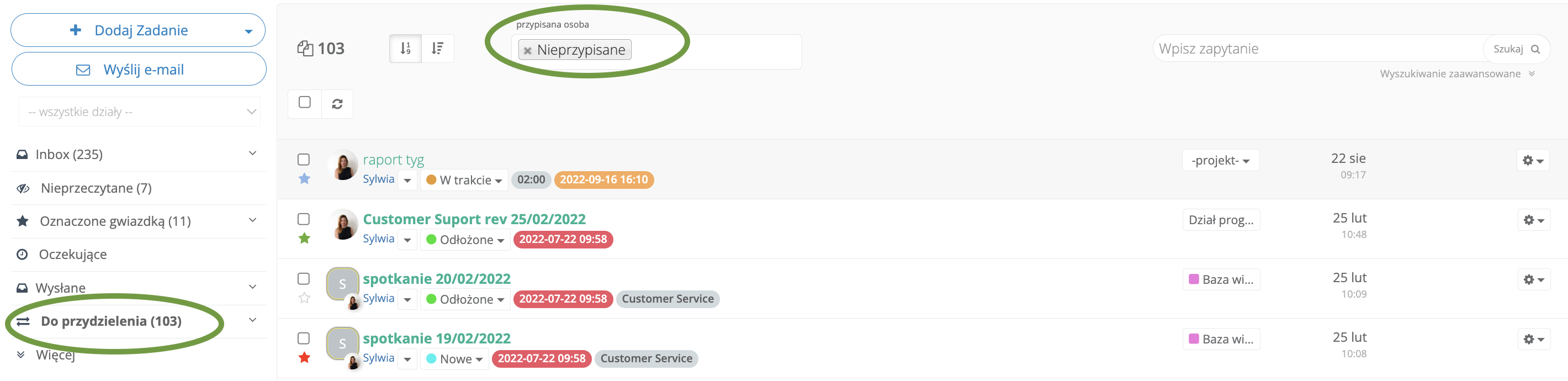 Do folderu Do przydzielenia trafiają również zadania, tak samo nie przypisane do żadnego użytkownika. Z tego miejsca każdy z użytkowników może pobrać mail/zadanie dla siebie lub przypisać je do konkretnego użytkownika.