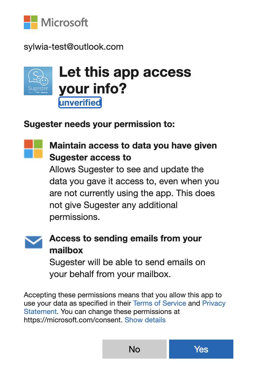 5. Po kliknięciu tego przycisku użytkownik zostanie automatycznie przeniesiony do konta Microsoft. Należy się do niego zalogować (login musi zgadzać się z adresem email skrzynki!) i zaakceptować zgody na dostęp dla Sugestera.