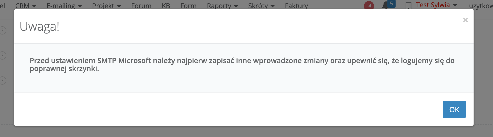 3. Zaznaczyć checkbox "Używaj własnej poczty SMTP", a w polu "Dostawca poczty" wybrać Microsoft. Po wybraniu tej opcji pojawi się komunikat jak ten poniżej. Należy kliknąć "OK".