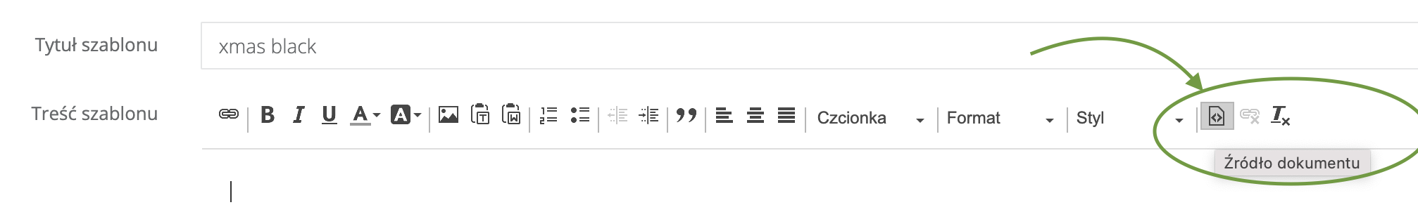 Aby skorzystać z wybranego szablonu należy skopiować podany pod szablonem kod HTML i wkleić w treść maila, podczas tworzenia mailingu. Żeby wkleić kod HTML należy w edytorze kliknąć ikonkę "Źródło dokumentu".