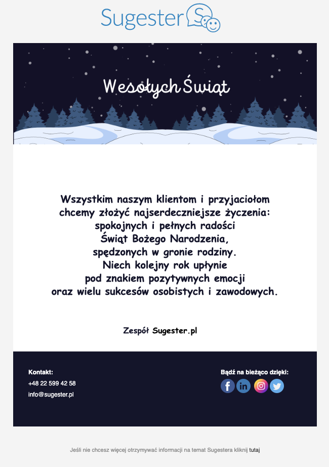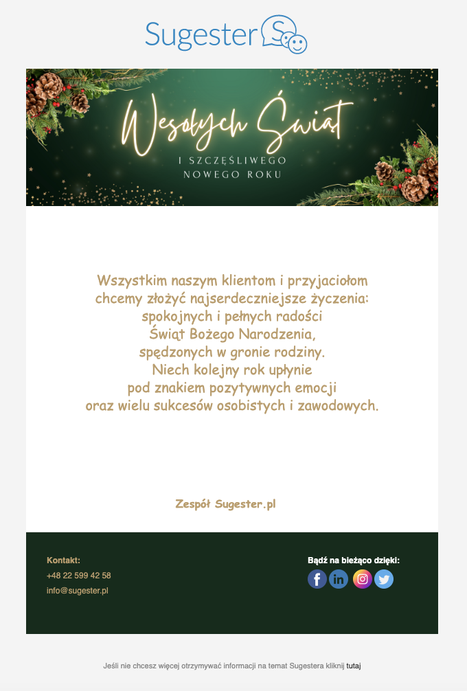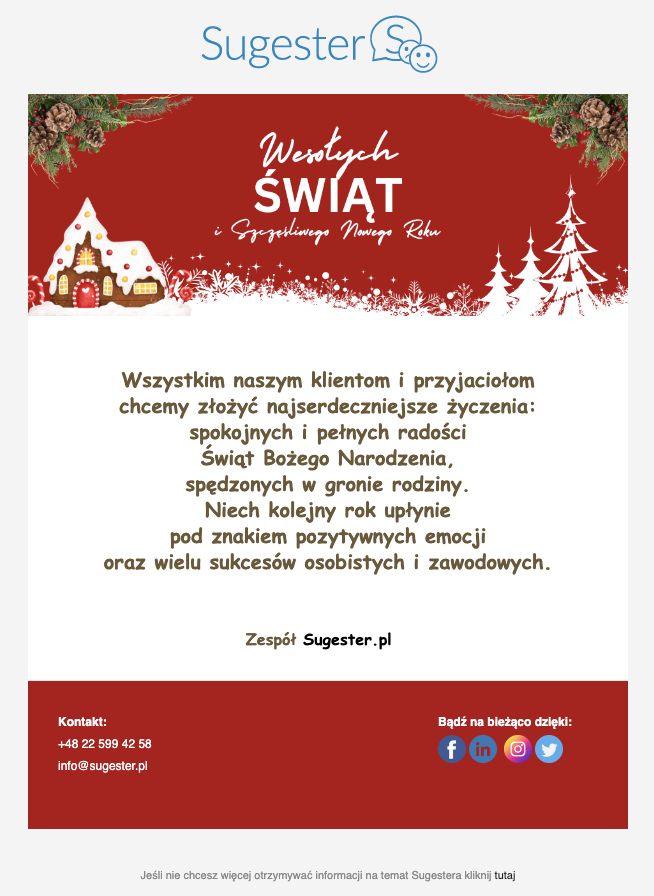- Życzenia świąteczne należy wysyłać za pomocą mailingu w Sugesterze. Wtedy żaden z odbiorców nie zobaczy maili pozostałych adresatów (dla osób, które dopiero zaczynają przygodę z mailingiem polecamy wpis Wysyłanie e-mailingu z Sugestera).