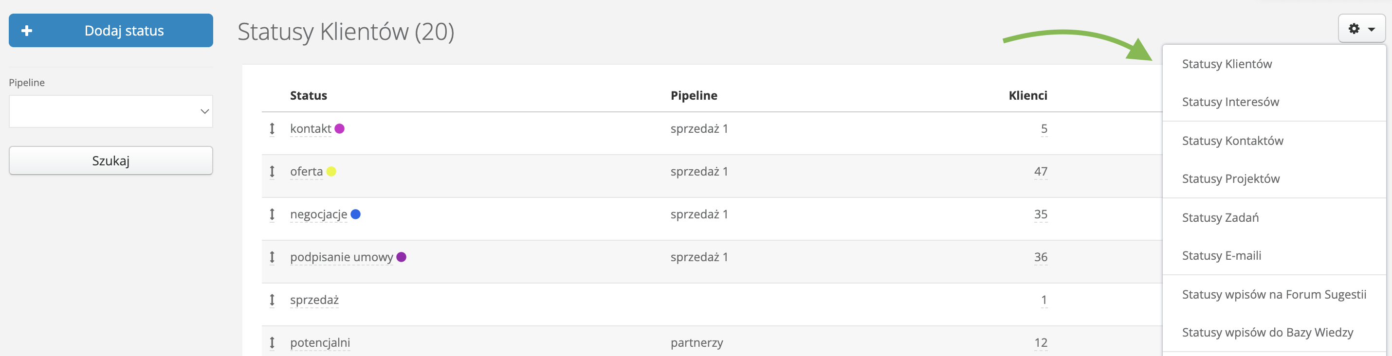 3. po wejściu w statusy pierwsze wyświetlają się statusy klientów. Wystarczy rozwinąć strzałkę przy ikonce trybiku w prawym górnym rogu, by przejść do kolejnych list statusów.
