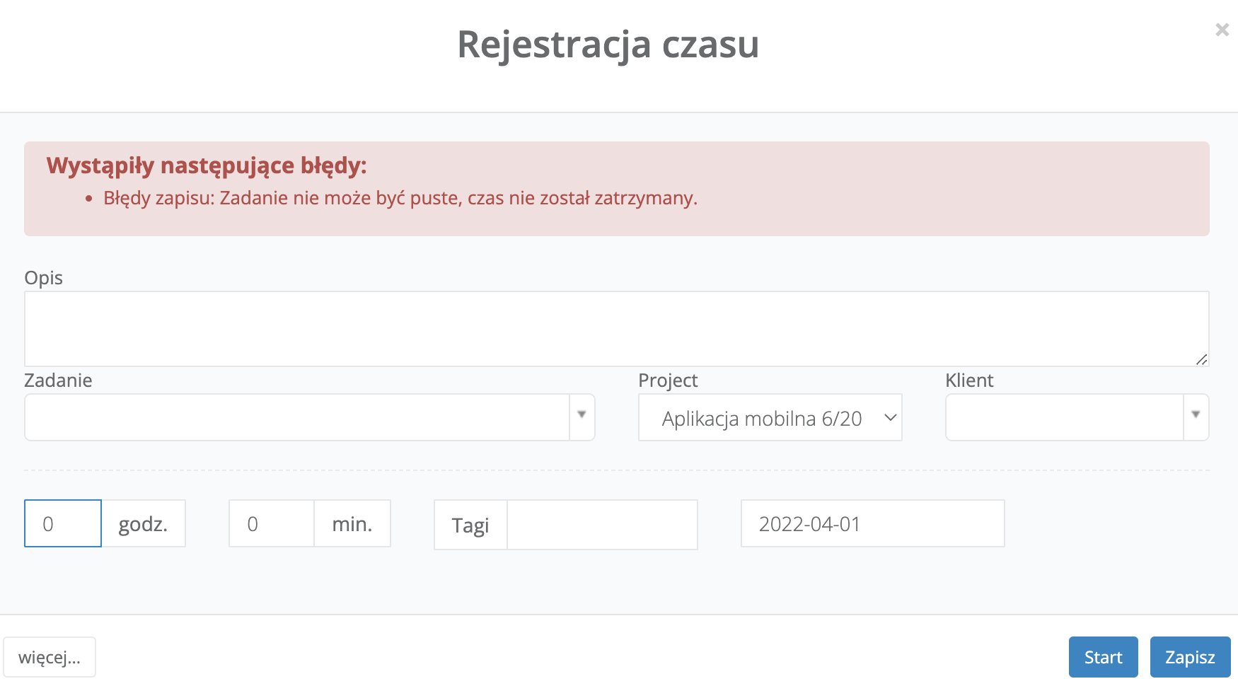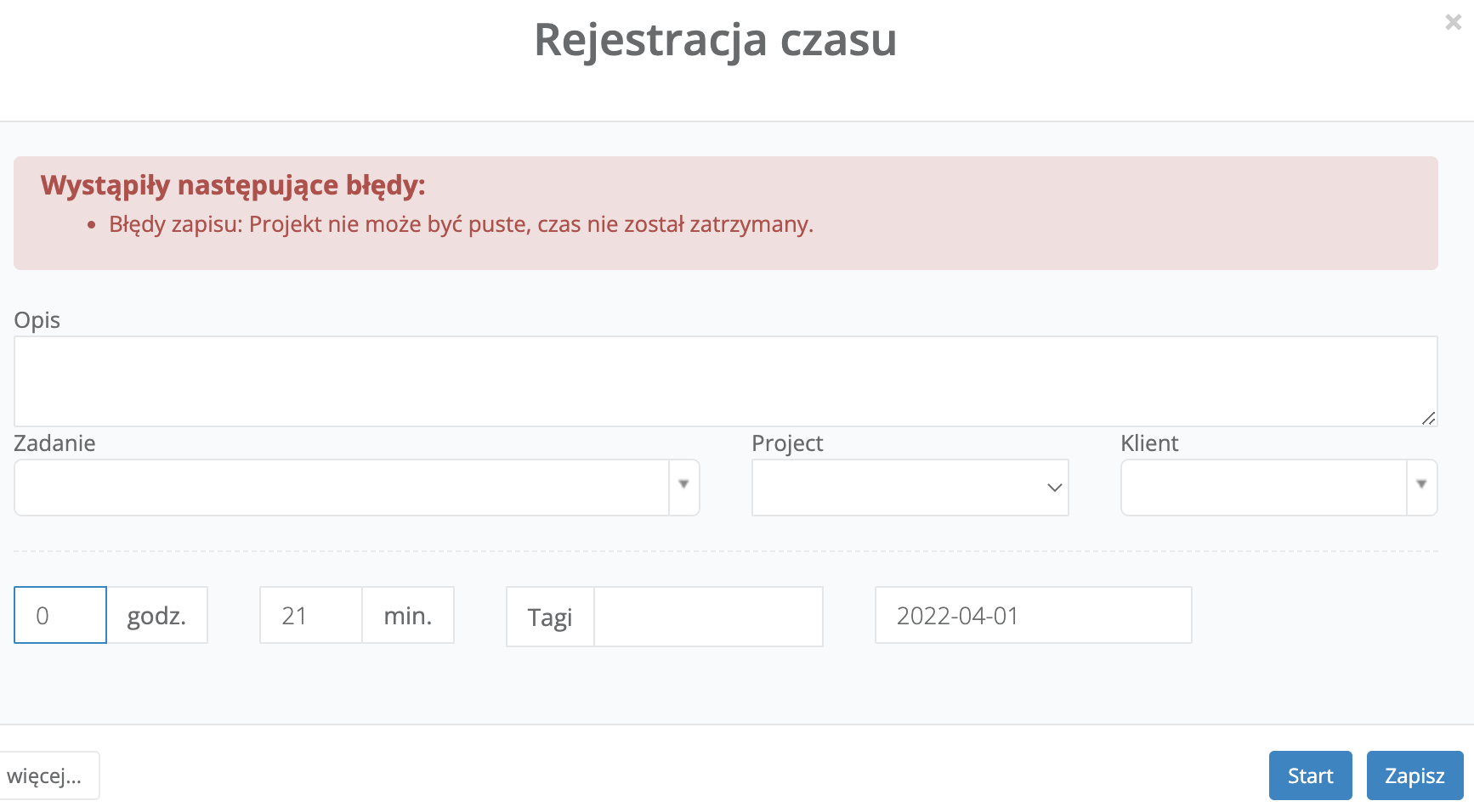 Wymagaj odniesienia do zadania - użytkownicy muszą wskazać zadanie, które zajęło im podawaną liczbę godzin. Jeśli zadanie nie zostanie wskazane, system nie pozwoli zatrzymać timera i wyświetli informacje, które dane należy uzupełnić.