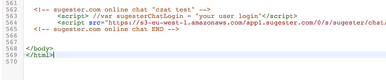 - Skopiuj skrypt live chatu Sugester do pliku tekstowego lub schowka. Znajdziesz go w Sugesterze w menu Ustawienia > Konfiguracja live chata. Twój kod będzie wyglądał podobnie do tego: