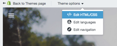 - W lewym górnym rogu ekranu kliknij przycisk Theme options i z rozwijanego menu wybierz opcję Edit HTML/CSS.