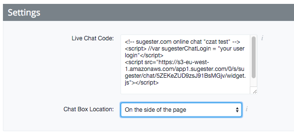 - Skopiuj skrypt live chatu Sugester do pliku tekstowego lub schowka. Znajdziesz go w Sugesterze w menu Ustawienia > Konfiguracja live chata. Twój kod będzie wyglądał podobnie do tego: