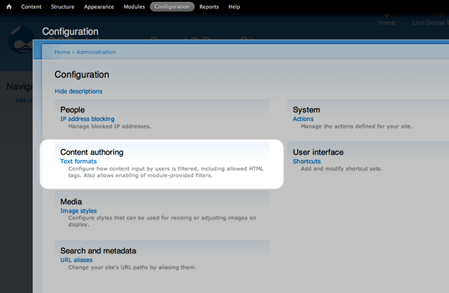 - Zaloguj się do swojego panelu administracyjnego i na górnej belce przejdź do zakładki Configuration > Content Authoring > Text formats.