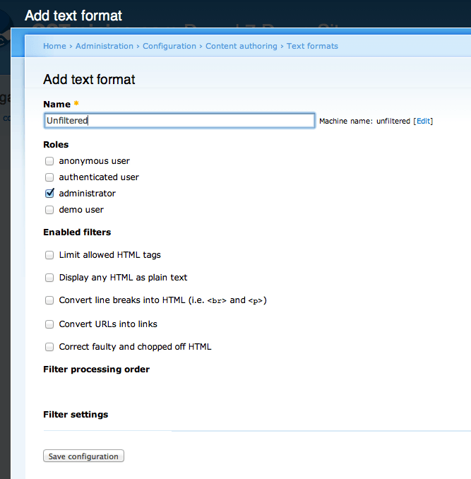 - Nazwij swój nowy format "Bez filtrowania" (lub podobnie - ważne, żeby było jasne że elementy w tym formacie nie są filtrowane). W sekcji Roles zaznacz opcję administrator, a w sekcji Enabled filters pozostaw wszystkie opcje odznaczone.