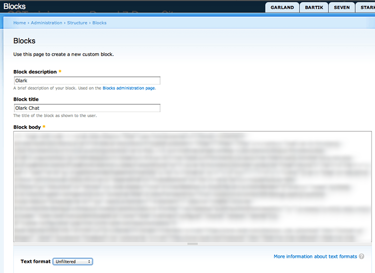 - W polu Block title podaj nazwę, którą będą widzieć użytkownicy (np. 'live chat'). W polu Block description podaj np. 'Sugester live chat'. W pole Block body wklej swój kod czatu z punktu pierwszego. Jako Text format wybierz "Bez filtrowania". Pozostałe ustawienia zostaw bez zmian/puste.