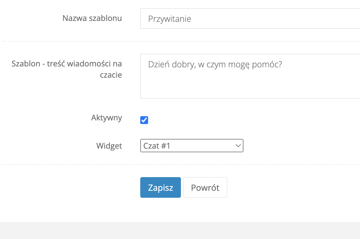 W nowootwartym oknie wyświetli się panel do uzupełnienia szablonu. W tym miejscu można wpisać nazwę szablonu, dzięki której będzie wiadomo czego szablon dotyczy, uzupełnić jego treść, oznaczyć czy jest aktywny i zdecydować, w którym widgecie będzie dostępny.