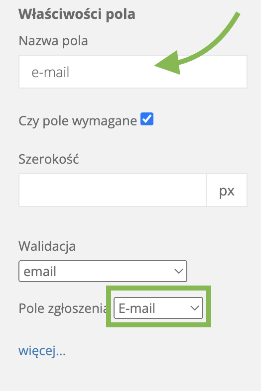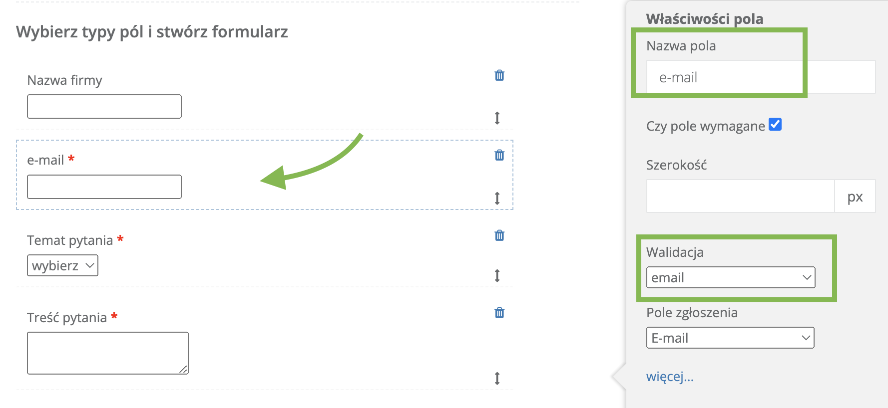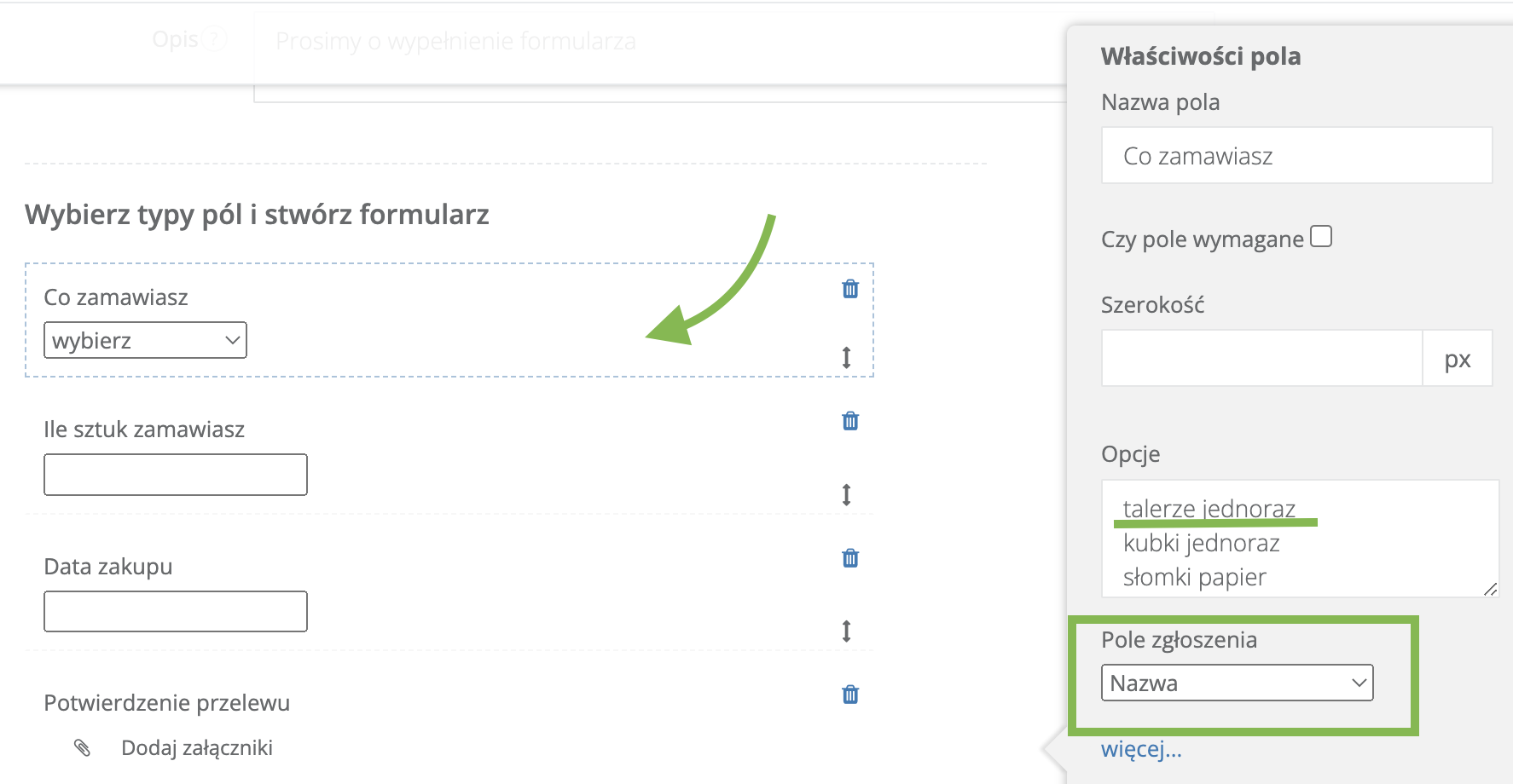 Przy tworzeniu formularza możesz zdecydować, które pola będą odpowiadały poszczególnym informacjom w zadaniu. Wystarczy, że po dodaniu każdego pola, w oknie Właściwości pola (wyświetlane po prawej stronie) przypiszesz odpowiednie Pole zgłoszenia.