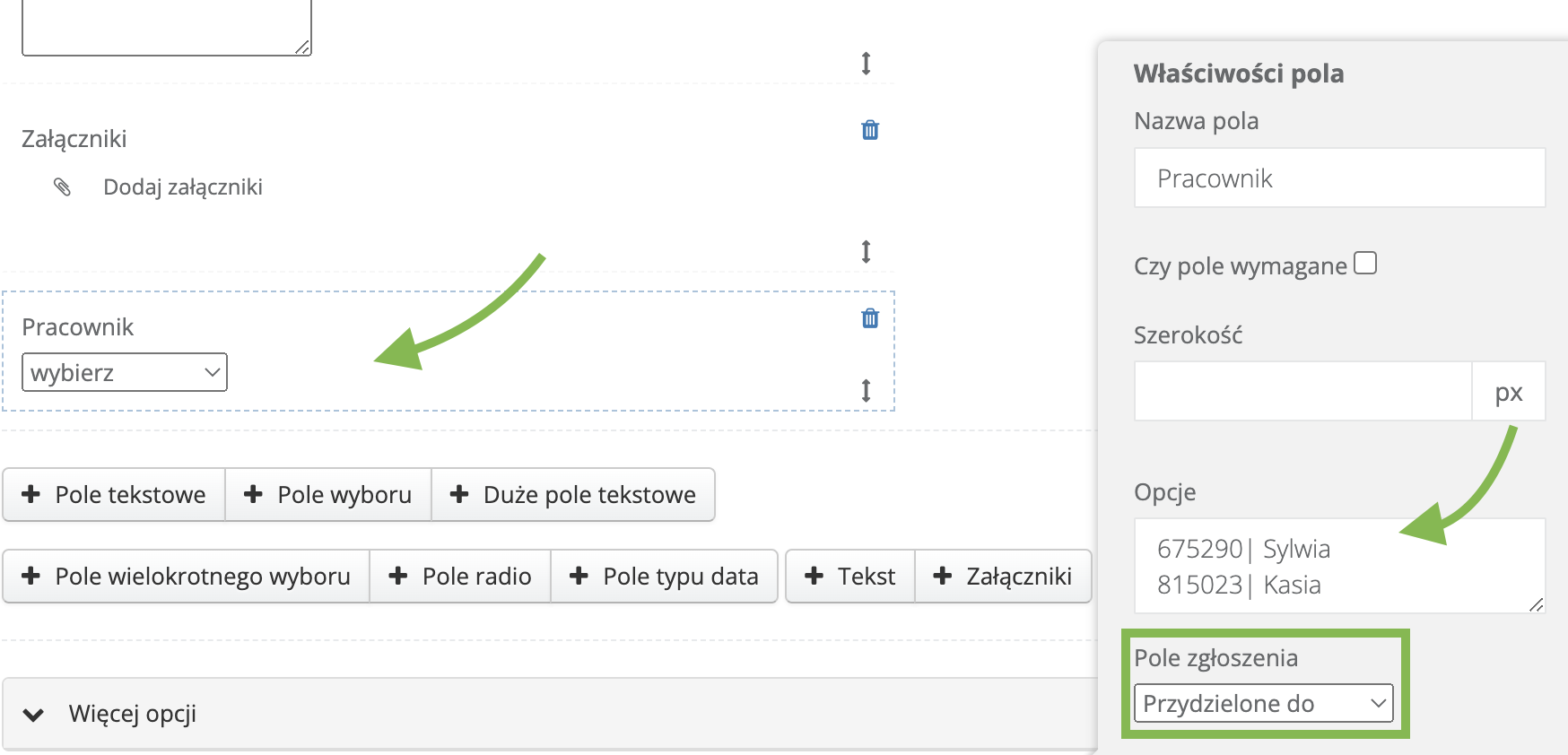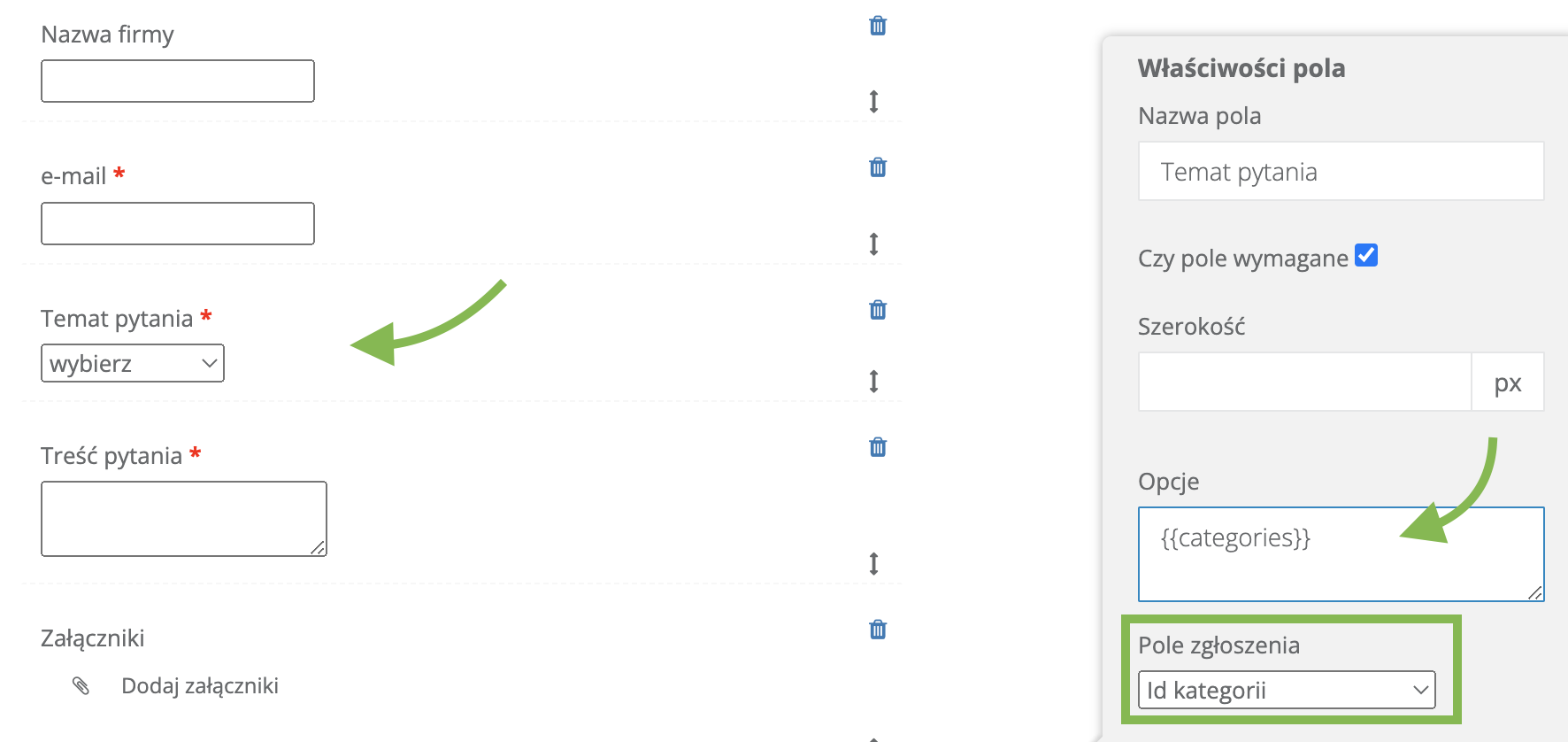 Przy mapowaniu na zadanie, możesz dać osobie wypełniającej formularz (czy to Twojemu klientowi, czy pracownikowi) możliwość przypisania wyników formularza do konkretnego projektu, sprintu lub użytkownika. To rozwiązanie możesz wykorzystać jeśli udostępniasz swój formularz dużemu klientowi, dla którego prowadzisz kilka projektów jednocześnie, albo gdy Twoi pracownicy za pomocą przygotowanego formularza zgłaszają sugestie dotyczące rozwoju firmy lub błędy w działaniu systemu. Podobnie jest z kategorią. Jeżeli za pomocą formularza Twoi klienci zgłaszają uwagi/usterki, możesz podzielić je na kategorie i dać klientom wybór czy chcą zgłosić błąd dotyczący działania systemu, wyświetlania aplikacji czy problemów z wersją mobilną. Dzięki kategoriom zachowasz porządek w swoich zgłoszeniach. Jeśli chcesz dodać do formularza opcję wyboru projektu, podprojektu, kategorii lub grupy w szarym okienku Właściwości pola, w miejscu Opcje należy wpisać odpowiednio: {{categories}} {{projects}} {{subprojects}} {{groups}} {{project_sprints}} Funkcja dostępna jest dla pola typu Pole wyboru i jego ustawienia powinny wyglądać jak te poniżej: