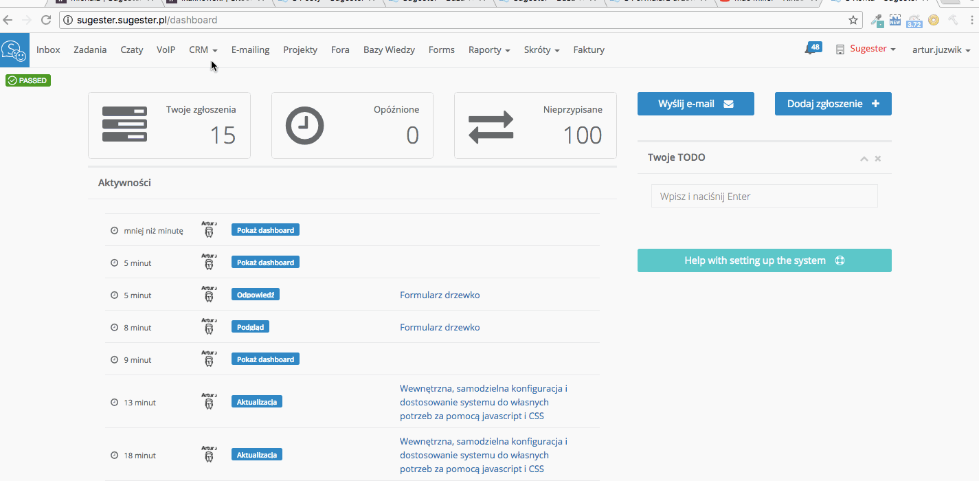 Przykład dodania elementu z podpowiedzią na ekranie edycji lub dodawania rozmowy VoIP (na podstronach http://NAZWA-KONTA.sugester.pl/app/voip/calls/####/edit lub http://NAZWA-KONTA.sugester.pl/app/voip/calls/new). Za pomocą tego javascriptu możemy dodawać dowolne elementy praktycznie na dowolnej podstronie w systemie (trzeba pamiętać żeby na górze skryptu dodać specyficzny zapis URLa).