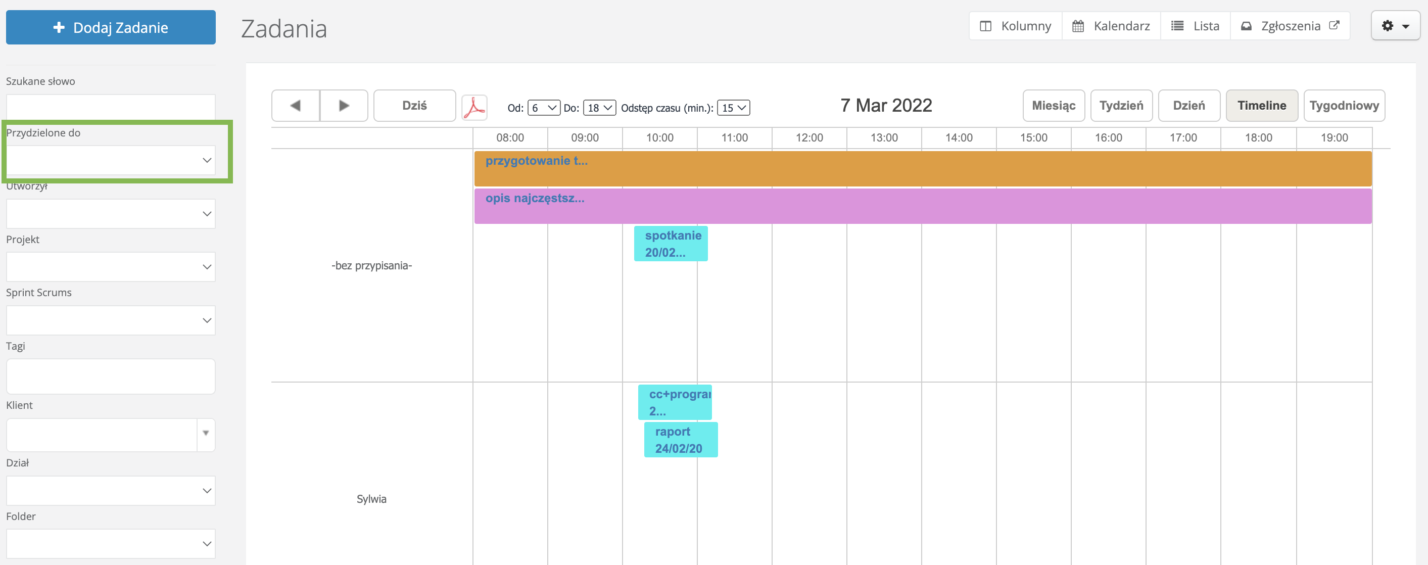 Aby wyświetlić wydarzenia wszystkich użytkowników pole Przydzielone do w wyszukiwarce po lewej stronie pozostawiamy puste.